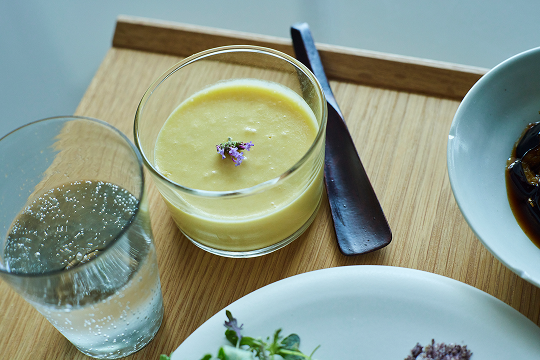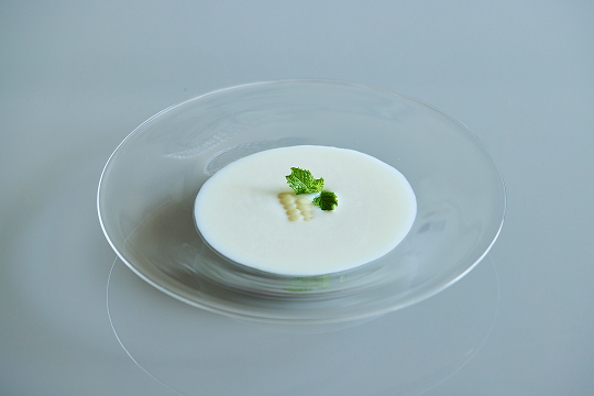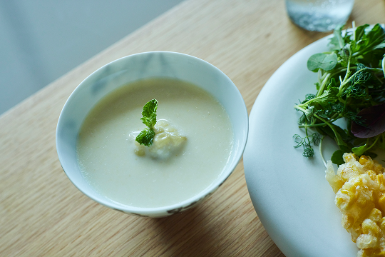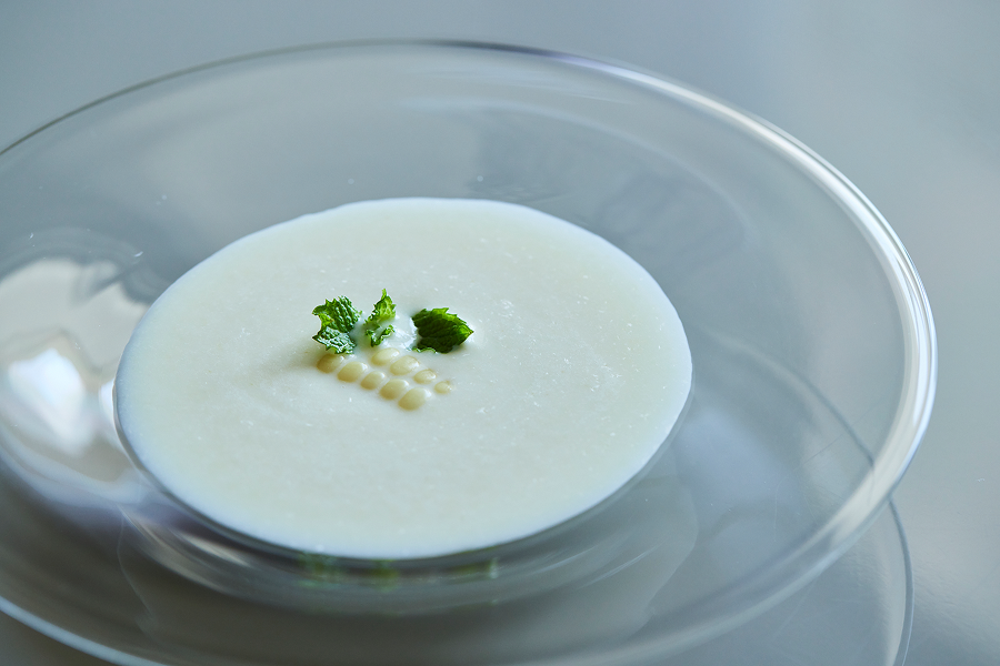 ホワイトコーンの甘みと玉ねぎのコクが溶け合う、なめらかで上品な冷製スープ。暑い季節にぴったりの一皿です。