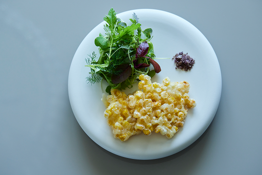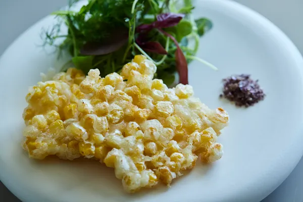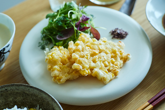 サクッと軽やかな衣に包まれたとうもろこし。ひと口頬ばれば、甘い粒がはじけます。