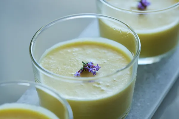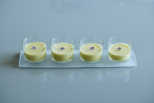 ミルクと生クリームのコクが引き立てる、とうもろこしのやさしい甘さ。なめらかな口どけが心地よい涼やかなデザートです。