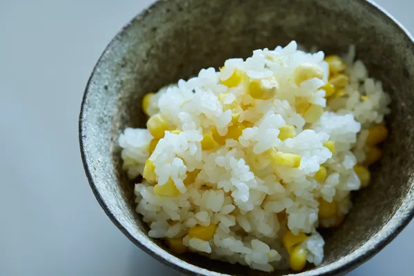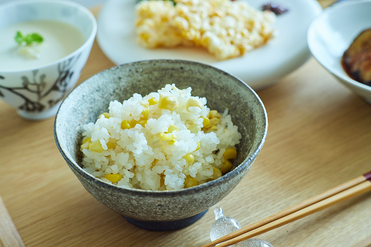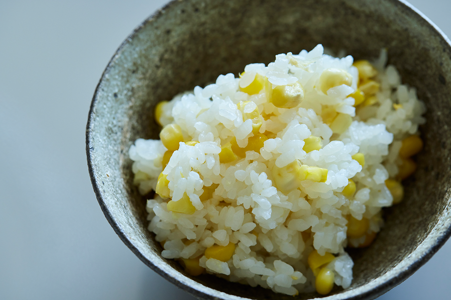 芯ごと炊き上げて旨みを引き出したご飯に、とうもろこしの自然な甘さが広がります。食卓を彩る季節の贅沢ご飯です。