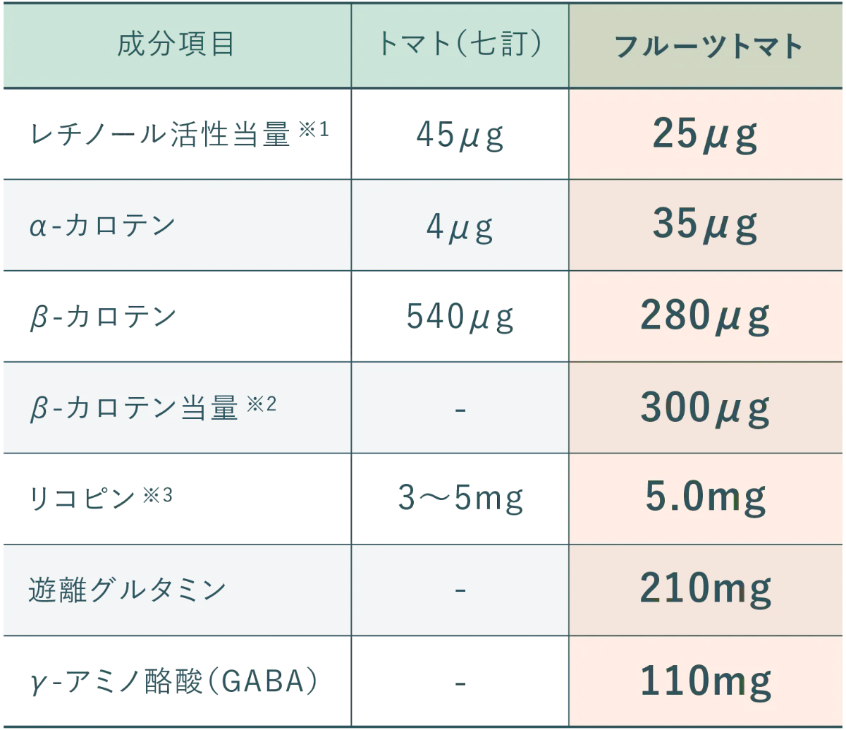 ※1 レチノール活性当量(μg)=レチノール(μg)+1/12-カロテン当量(μg) ※2 βカロテン当量(μg)=β-カロテン(μg)+1/2α-カロテン(μg)+1/2クリプトキサンチン(μg) ※3 カゴメ調べ
