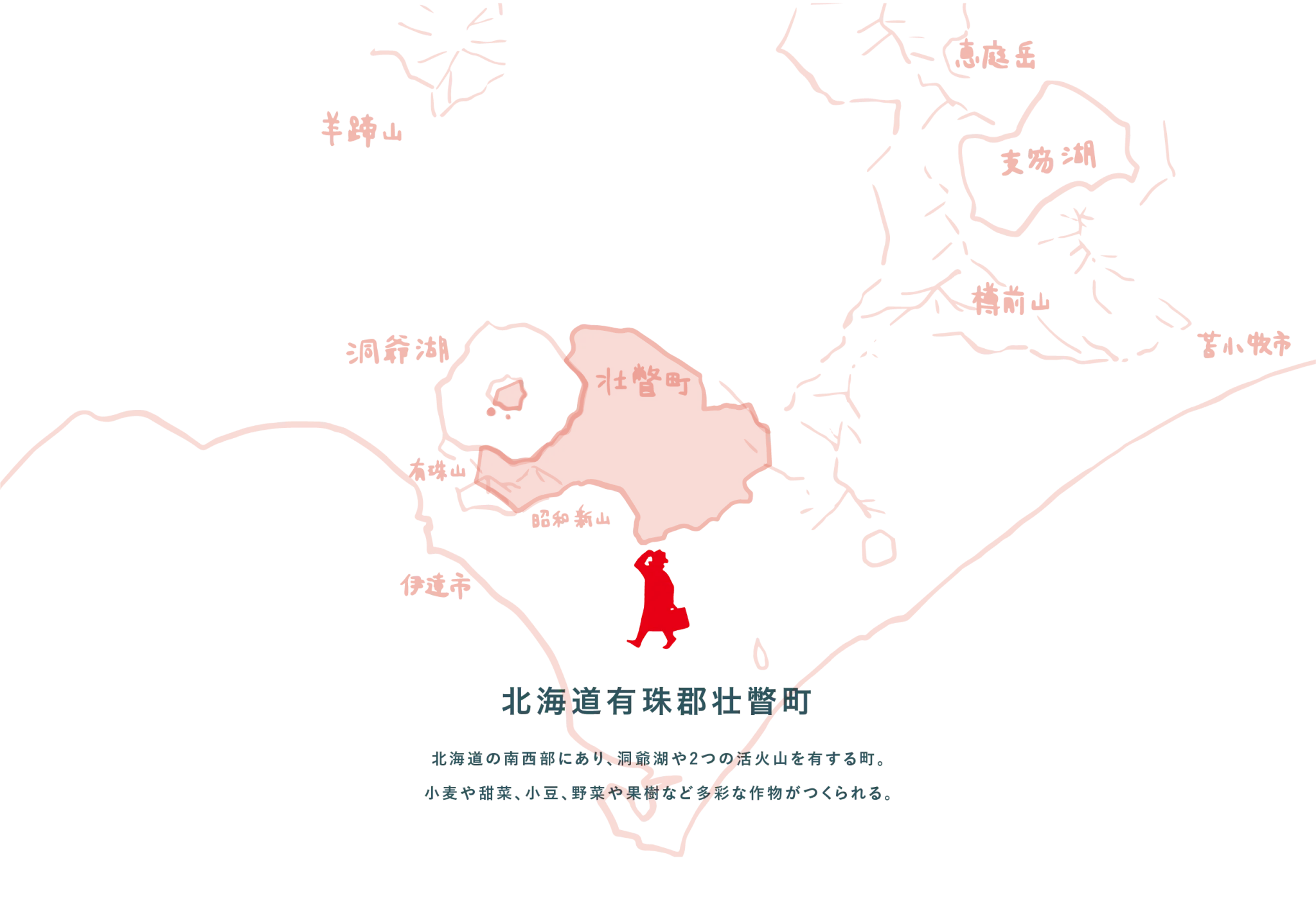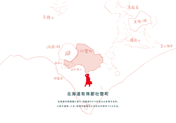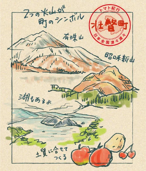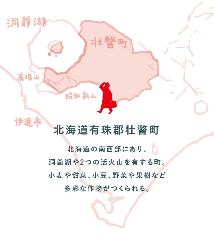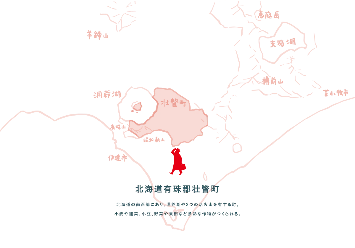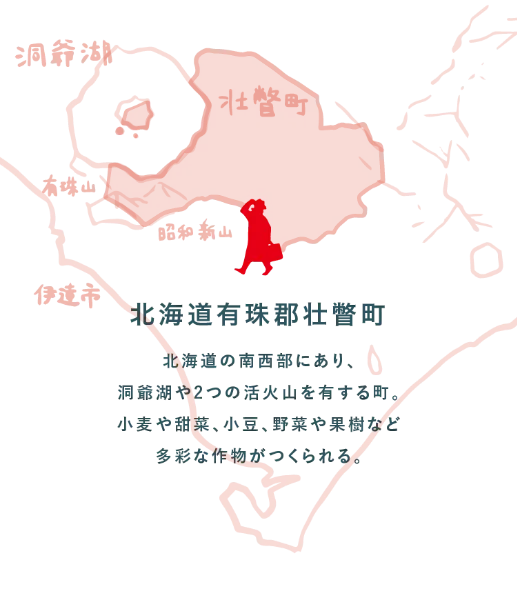 洞爺湖の南東岸に面し、有珠山と昭和新山の2つの火山を有する有珠郡壮瞥町は、北海道の中でも夏は涼しく冬は温暖な気候が特徴。町内には粘土地と火山灰地の土壌が広がり、それぞれの土質に合わせて小麦や甜菜、小豆、リンゴやサクランボ、じゃがいもやトマトなどがつくられています。