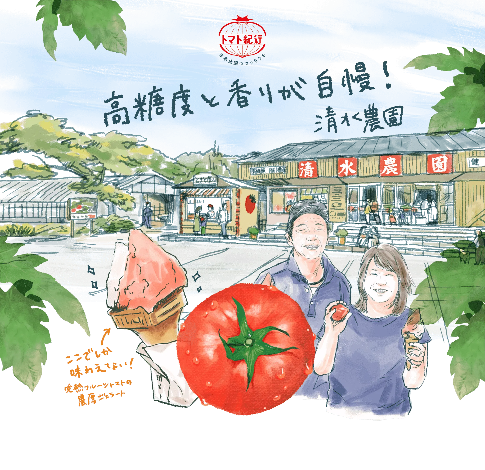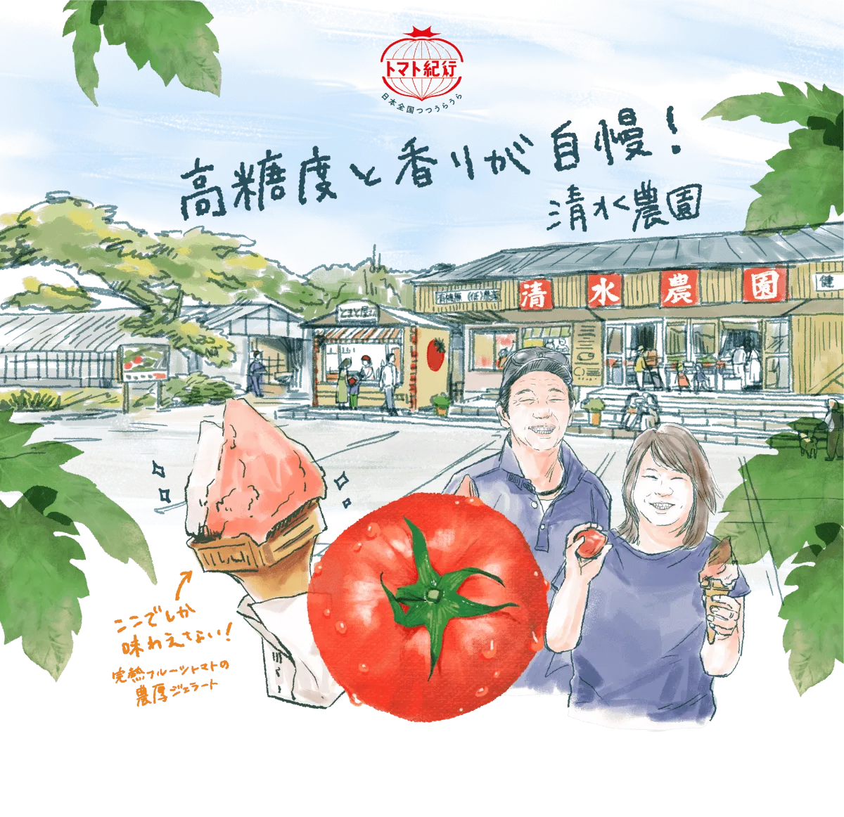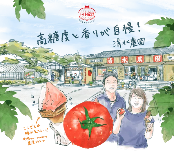 有珠山と昭和新山を背景に、雄大な自然の中で農業を営む清水農園。農園3代目の清水達雄さん・英子さん夫婦は、自身の代から新たな挑戦としてフルーツトマトのハウス栽培を始めました。長年試行錯誤しながら育てたこのフルーツトマトは、10度以上という糖度の高さはもちろん、糖度と酸度のバランス、トマト本来の香りがしっかりと楽しめる、今や農園を代表するトマトに。その美味しさをもっと楽しんでもらいたいと直売所やジェラート店もオープンし、地元の人からも愛される味となっています。