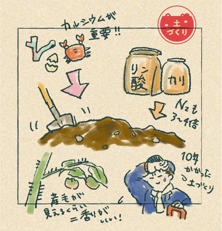「フルーツトマト栽培の一番のポイントは土づくり」という清水さん。粘土地である農園の土壌を生かしながら何年も土をつくり続けて分かったのは、カルシウムの重要性だといいます。サンゴの石灰石や卵の殻、カニの殻などを土に混ぜ、カルシウム分が豊富な農園独自の土をつくりました。