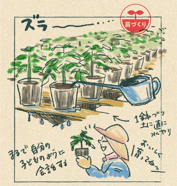 養分豊富な土づくりの次に大切なのは、苗づくり。なぜなら、普通の苗木だと肥料分が強すぎる土に負けて、枯れてしまうなどして上手く育たないからです。
